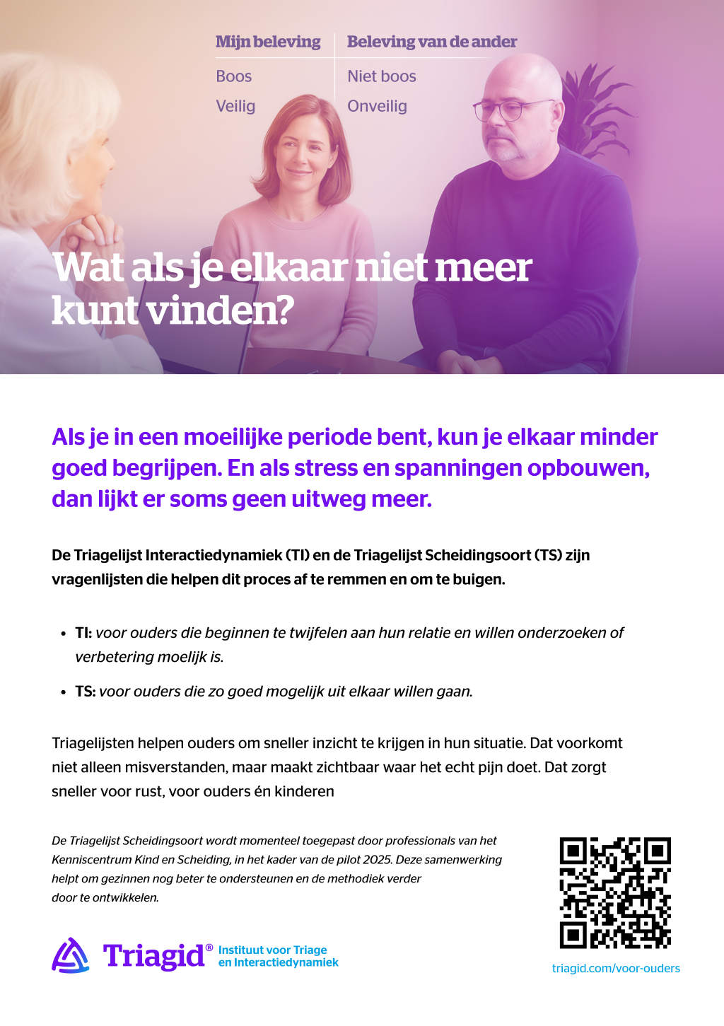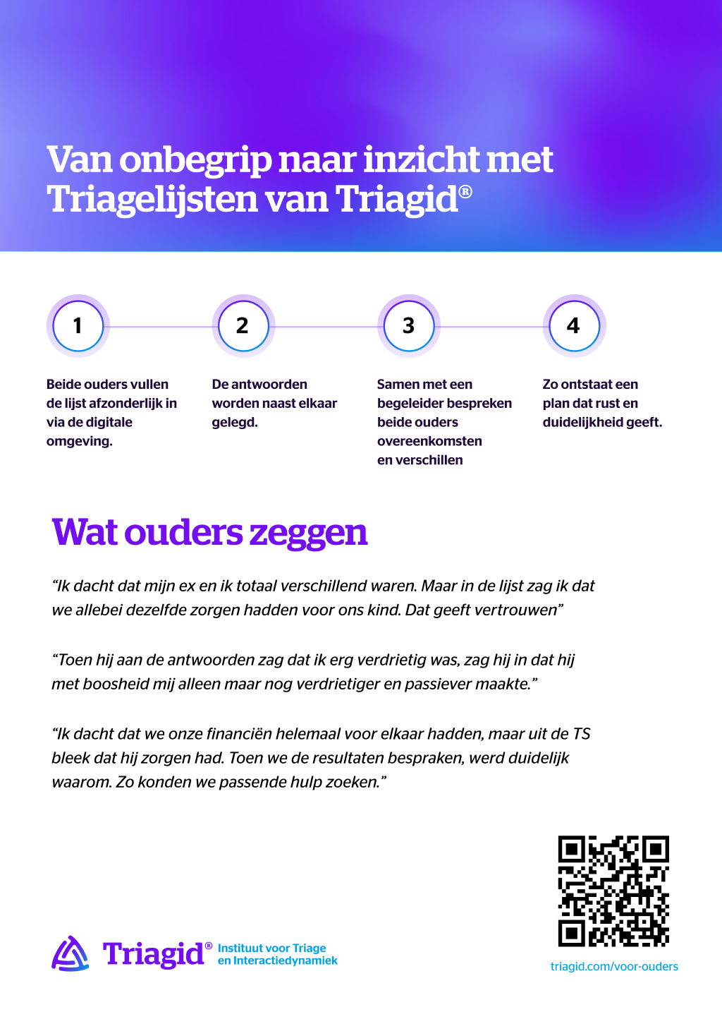 In de folder onder aan deze pagina en op de website van Triagid® vind je meer uitleg over de inhoud en werkwijze: Triagid® voor ouders en bij Kenniscentrum Kind en Scheiding